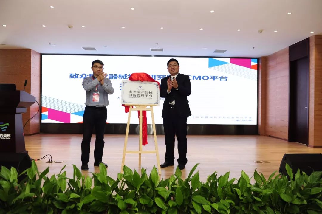 武漢軟件新城發(fā)展有限公司總經(jīng)理梁勇(左)與致眾科技副總經(jīng)理許鵬(右)為“光谷醫(yī)療器械創(chuàng)新促進(jìn)平臺(tái)”揭牌。