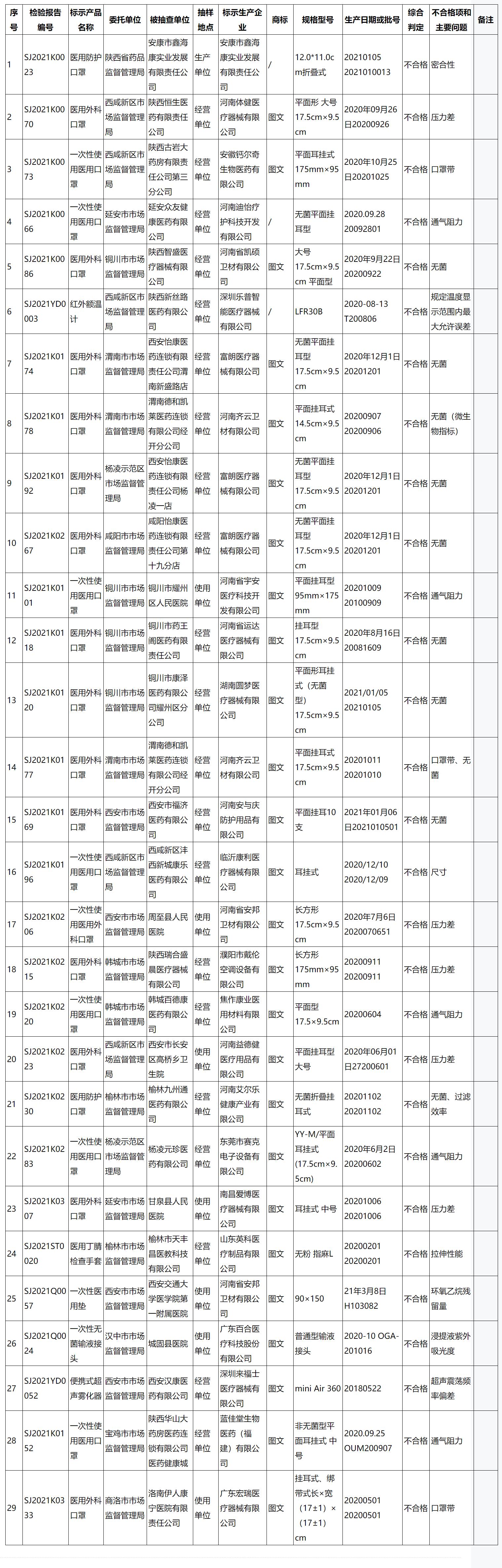 為加強(qiáng)醫(yī)療器械質(zhì)量監(jiān)管,保障公眾用械安全,根據(jù)2021年陜西省醫(yī)療器械監(jiān)督抽檢計劃,陜西省藥品監(jiān)督管理局組織在全省醫(yī)療器械生產(chǎn)、經(jīng)營企業(yè)和使用單位開展醫(yī)療器械監(jiān)督抽檢工作。經(jīng)陜西省醫(yī)療器械質(zhì)量檢驗院檢驗,現(xiàn)對29批次不符合標(biāo)準(zhǔn)規(guī)定產(chǎn)品予以公告(見附件)。